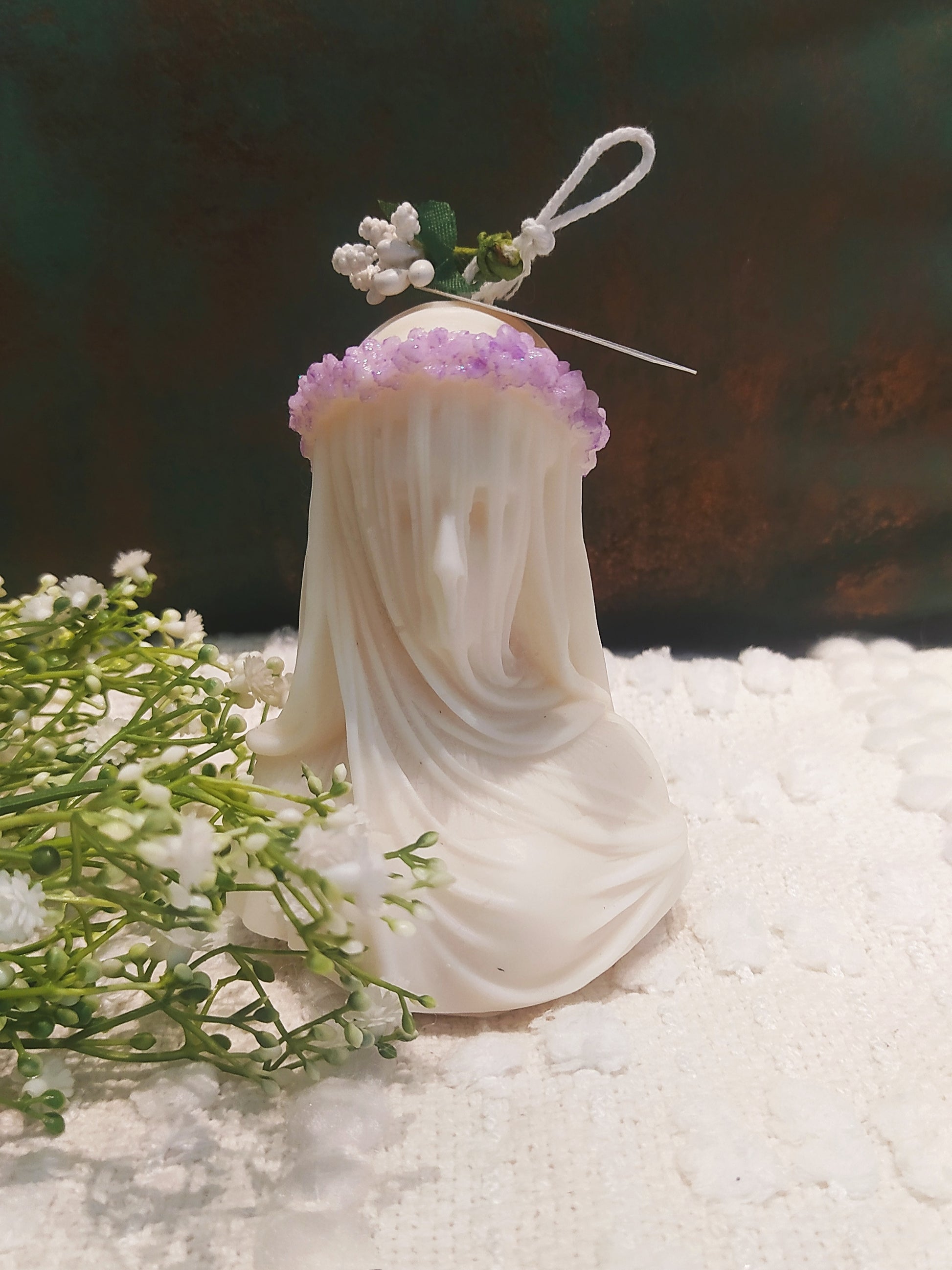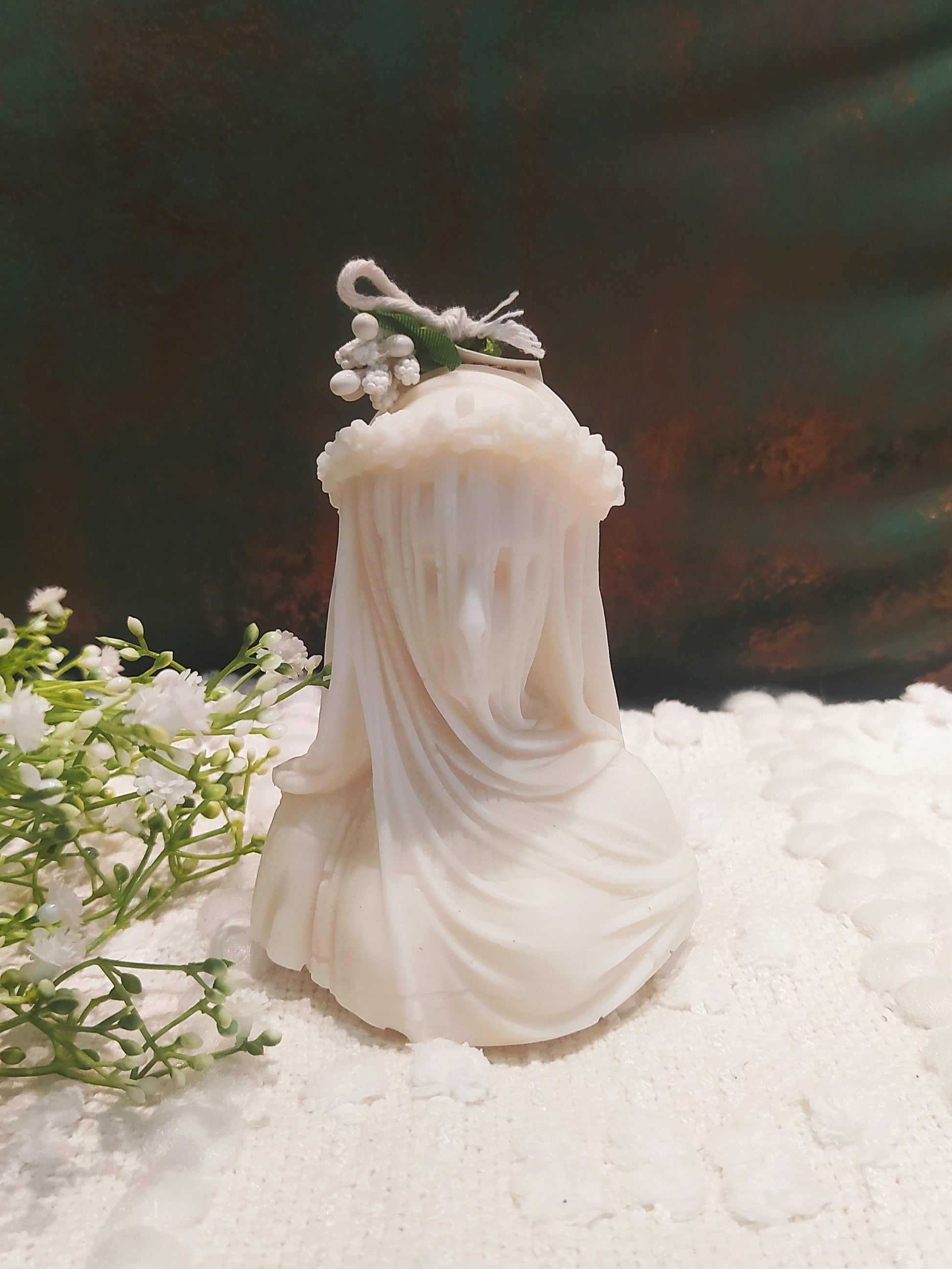 Meet Bella, the epitome of elegance and mystery. This sculpted candle captures the timeless beauty of a lady draped in a delicate veil, making it a stunning piece of art for your space.