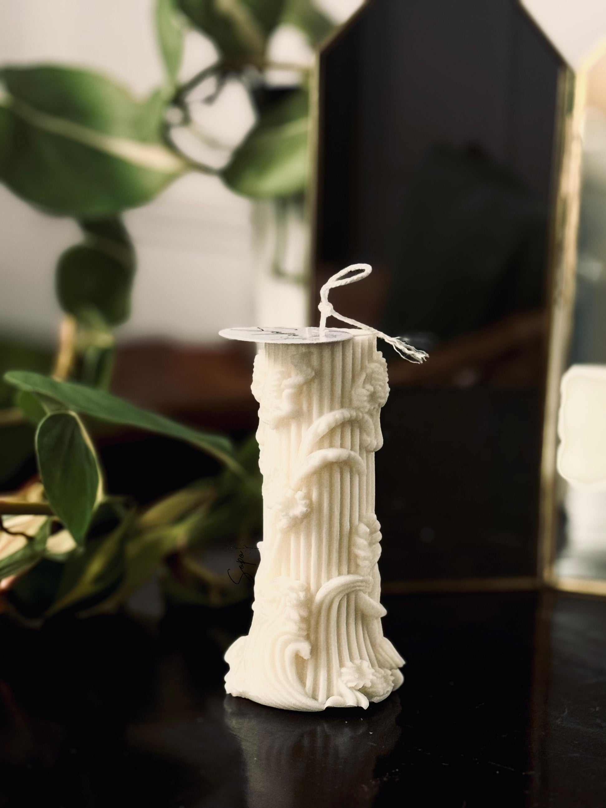 Inspired by quiet gardens and soft light, our Charlie Pillar Candle with Flower Ivy design is carefully hand-shaped using 100% soy wax.
