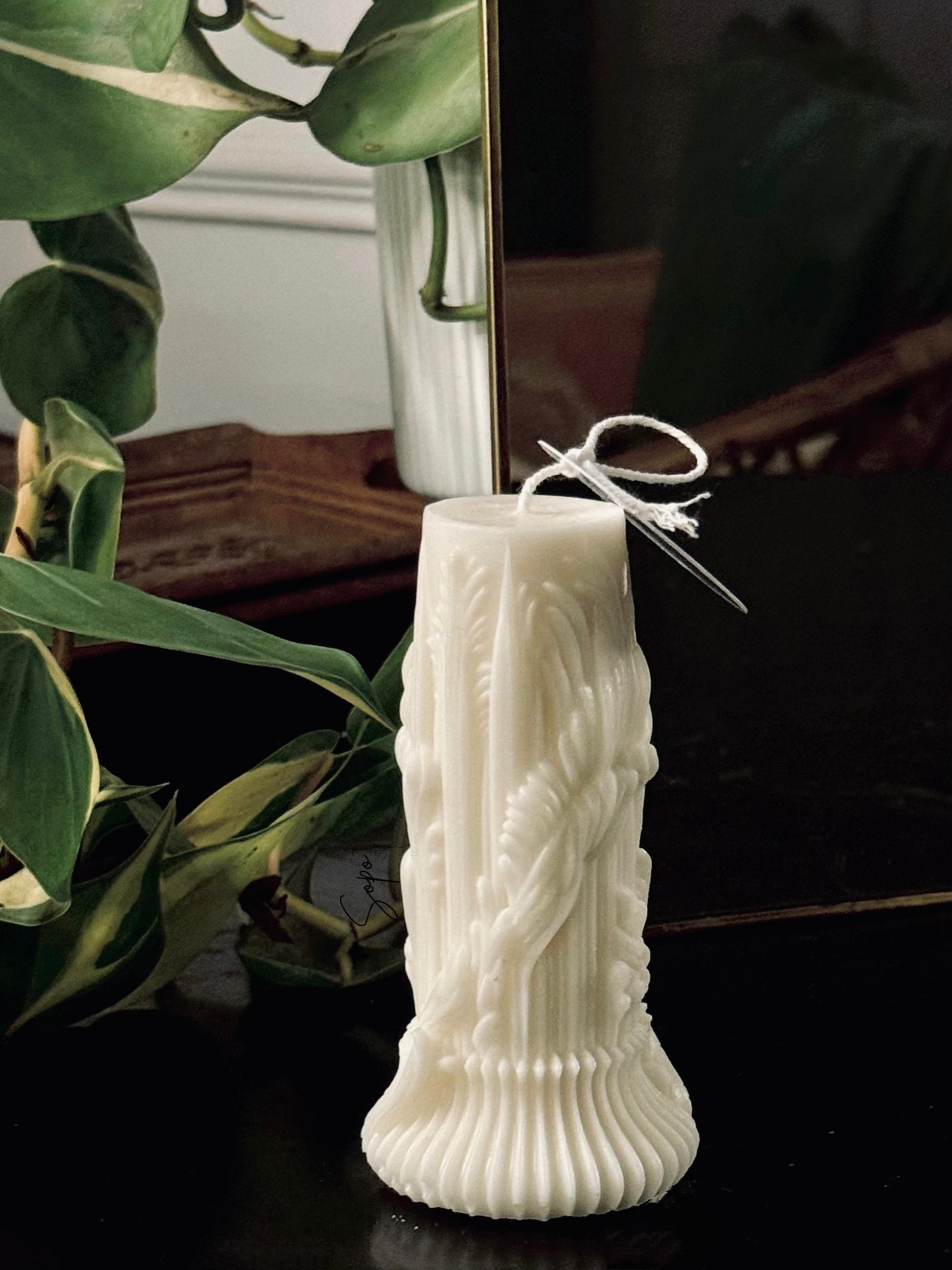 Our LOLA Candle is a ribbed pillar candle adorned with a delicate botanical design, celebrating nature’s quiet beauty.